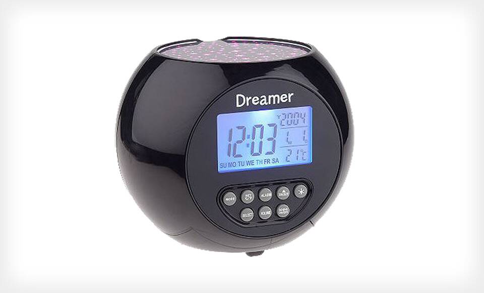 Defy the laws of nature with the Dreamer Starlight Projector clock, which illuminates walls and ceilings with flashing stars any time of day. The digital alarm clock displays the date and temperature to remind you how much warmer it is indoors, and it even plays soothing nature sounds to lull you to sleep or tame the wild birds nesting in your closet.