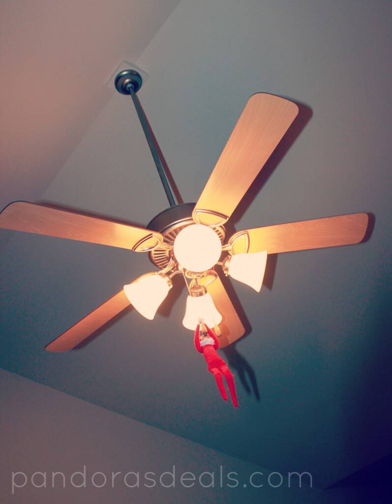 I don’t know if you can see how I actually knotted the light cord around Tootsie’s wrists. So good luck, me, getting that undone while standing on the back of a couch. And if you’re wondering those red fringe-like things are pieces from a the string of a balloon that met an untimely end in the ceiling fan. I can’t get them off either. (Thanks, kids!)