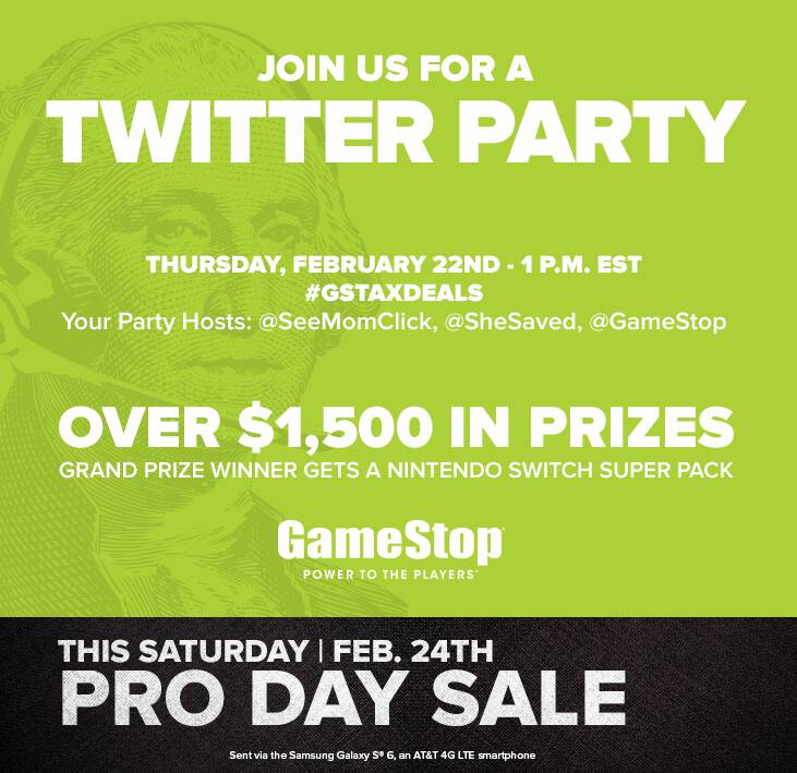 Join me with @SheSaved and our sponsor, @GameStop, for the #GSTaxDeals Twitter party on Thurs Feb 22 at 1pm ET for an awesome event! $1500 in gaming prizes up for grabs! #TwitterParty RSVP here: https://t.co/84aBoJFbpk pic.twitter.com/vNYYaNTvMq
