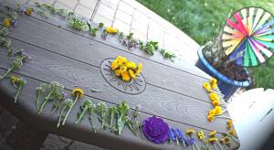 Happy Monday! I hope you all had a good weekend. We had some fun playing outside yesterday and today’s Monday’s Moment is a picture of my daughter’s nature art. She made this when no one was looking on her little picnic table and then came and got me, “Mom! Look what I made!” She used all the dandelions and other weeds she could find to make something beautiful. Only kids see beauty in weeds, right? She did throw in a few of my grape hyacinths and her purple flower hair clip for good measure, but mostly this is weed art. And I think it’s beautiful. My little girl is so creative. I just love to see what she comes up with when she uses her imagination. And I love that she sees beauty everywhere, even in weeds. It’s a good lesson for Mommy, too.