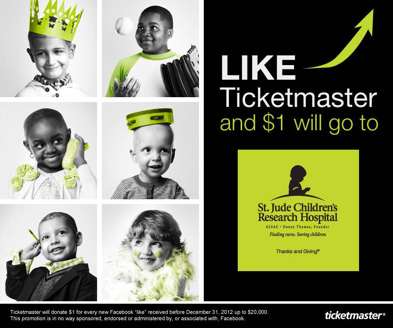 Here’s the easiest thing you might ever do to pay it forward! Ticketmaster is donating $1 to St. Jude Children’s Research Hospital for every new Facebook like through December 31 up to $20,000!  If you’re a Facebook user, head over and give them a ‘like’!   I just did and saw they’ve already raised over $13,000.  WOW!